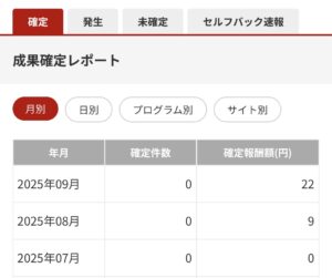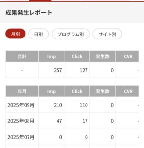 前月と比較してインプレッション率やクリック率は倍以上に増えました!ですが、ご覧の通り、クリックはされたものの、収益につながる「発生件数」は0でした。つまり、読者が広告をクリックしても、商品やサービスの購入、申し込みには至らなかったということです。ブログを始めたばかりだと、記事の内容や広告の配置を最適化できていないため、このような結果になりがちです。いまこの記事を読んでくれている方が広告から購入してくれたら記念すべき第1号になります!笑