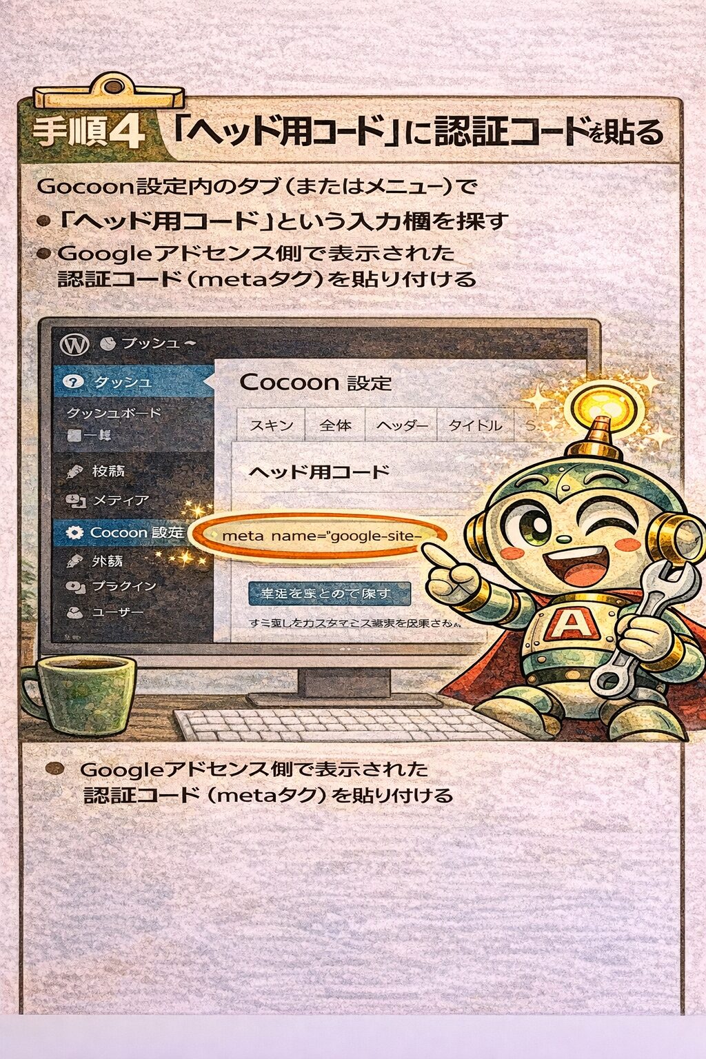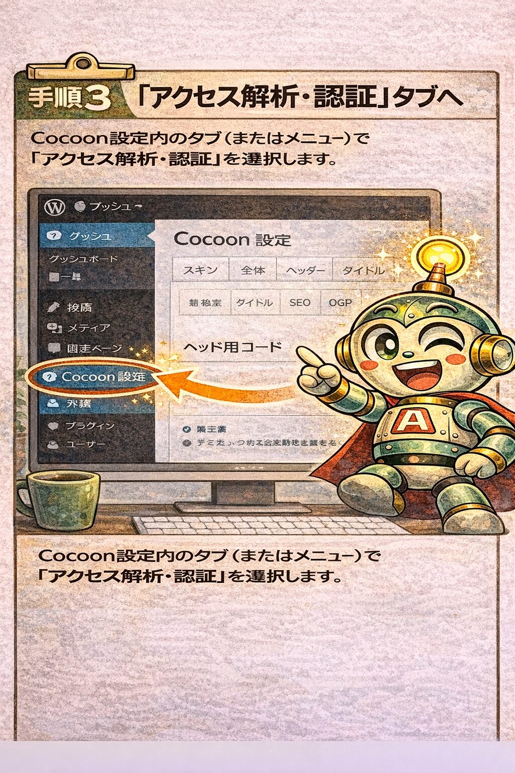 「Cocoon設定 → アクセス解析・認証」タブ → 「ヘッド用コード」 に貼り付ける