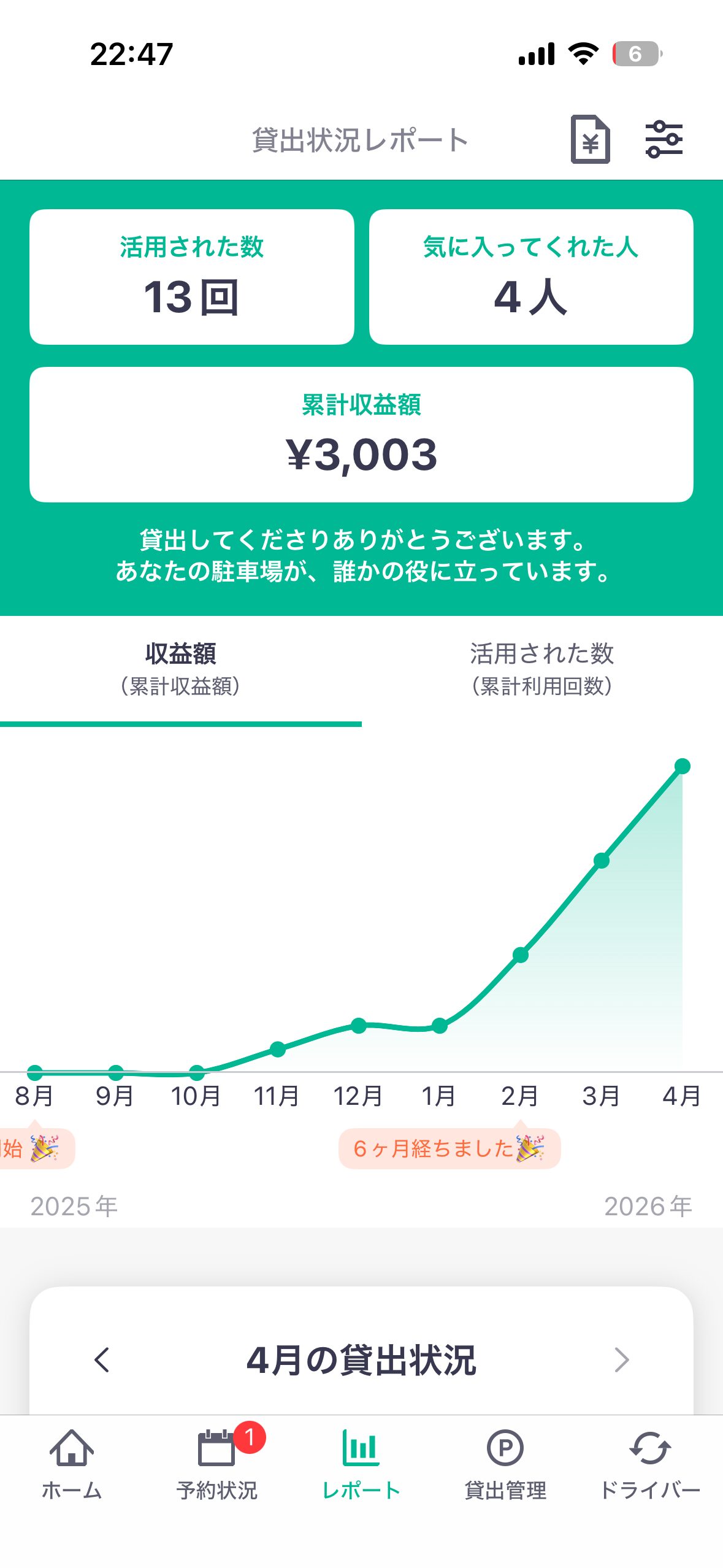 実際の貸出状況レポート。少しずつ利用が増え、累計収益も伸びてきました。