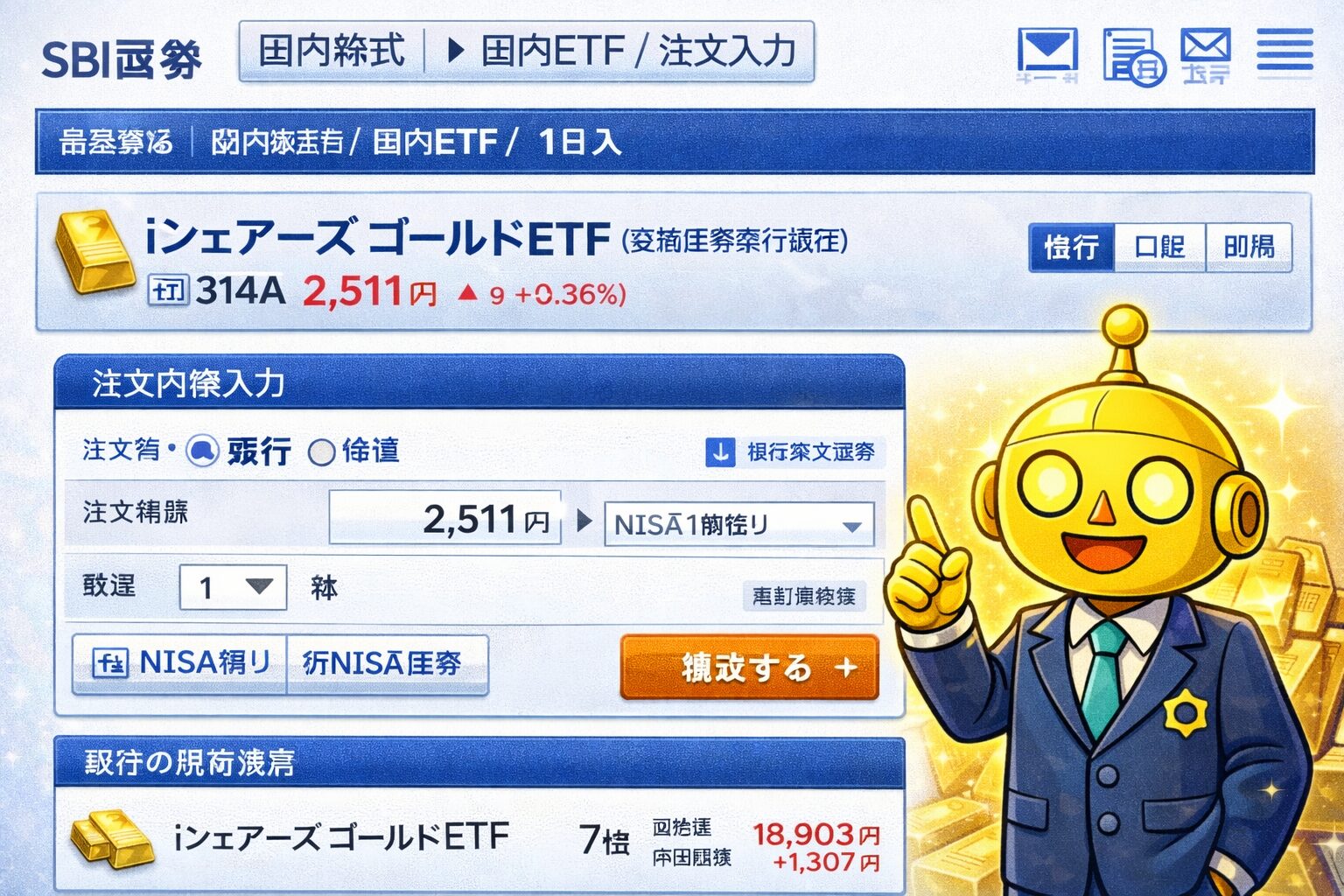 方法は現物ではなく、証券口座で管理できるゴールドETF(iシェアーズ等)です。