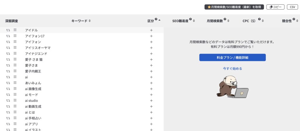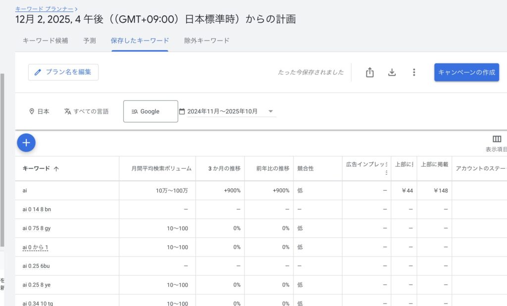 キーワード調査で、気になるワードを入れると、検索されているワードの羅列が出てきます。その羅列をコードごとコピーし、グーグルキーワードプランナーに入れると検索ボリュームが調査できます。